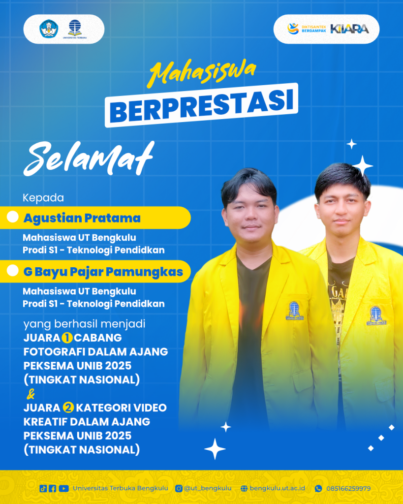 Bengkulu — Dua mahasiswa Universitas Terbuka (UT) Bengkulu kembali mencatatkan pencapaian membanggakan di ajang Pekan Seni Mahasiswa (PEKSEMA) Universitas Bengkulu 2025, sebuah kompetisi seni tingkat nasional yang diikuti ratusan mahasiswa dari berbagai perguruan tinggi di Indonesia.