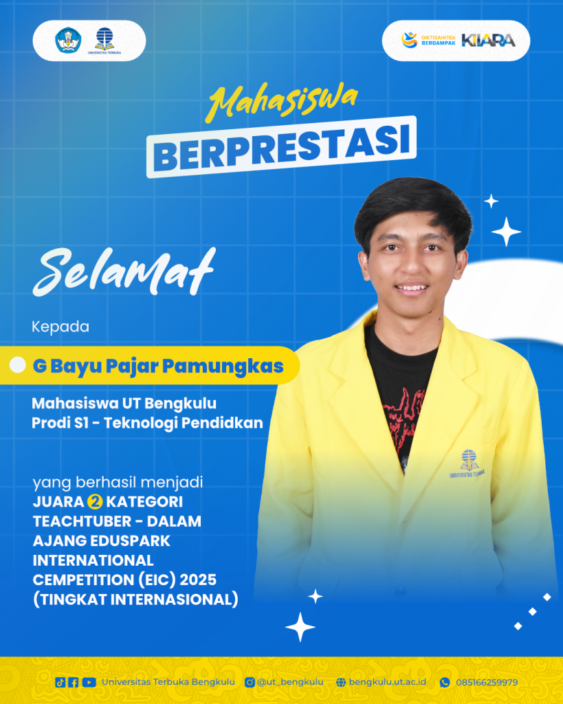 Bengkulu — Mahasiswa Universitas Terbuka (UT) Bengkulu kembali menorehkan prestasi gemilang di ajang internasional. G Bayu Pajar Pamungkas mahasiswa prodi Teknologi Pendidikan dengan NIM: 049075429 ini berhasil meraih Juara 2 di Kategori TeachTuber pada EduSpark International Competition (EIC) 2025, sebuah kompetisi inovasi pembelajaran tingkat internasional yang menjadi bagian dari rangkaian Lomba Inovasi Pembelajaran & Kreativitas Mahasiswa Nasional (LIP-KMN).