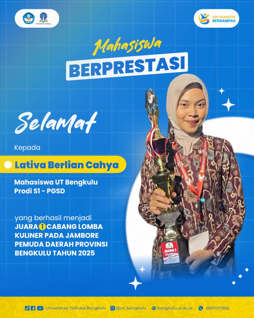 Selamat kepada Lativa Berlian Cahya atas prestasi yang membanggakan ini. Semoga semangat dan dedikasinya dapat menjadi motivasi bagi seluruh mahasiswa UT Bengkulu untuk terus berkarya dan mengharumkan nama almamater.