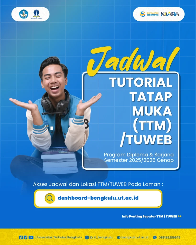 Wisuda merupakan prosesi akhir sebagai bentuk kelulusan hasil belajar yang telah ditempuh mahasiswa sebagai bentuk keberhasilan mahasiswa dalam menempuh masa studi dan meraih gelar sarjana dan pasca sarjana. Setelah masa pandemic, Universitas Terbuka Bengkulu untuk pertama kalinya menyelenggarakan wisuda secara luring pada hari Rabu tanggal 1 Maret 2023. UT Bengkulu telah melaksanakan Wisuda Daerah secara tatap muka di Grage Hotel Bengkulu yang dihadiri sebanyak 542 wisudawan dari FKIP, FE, FST, dan FIHSIP.