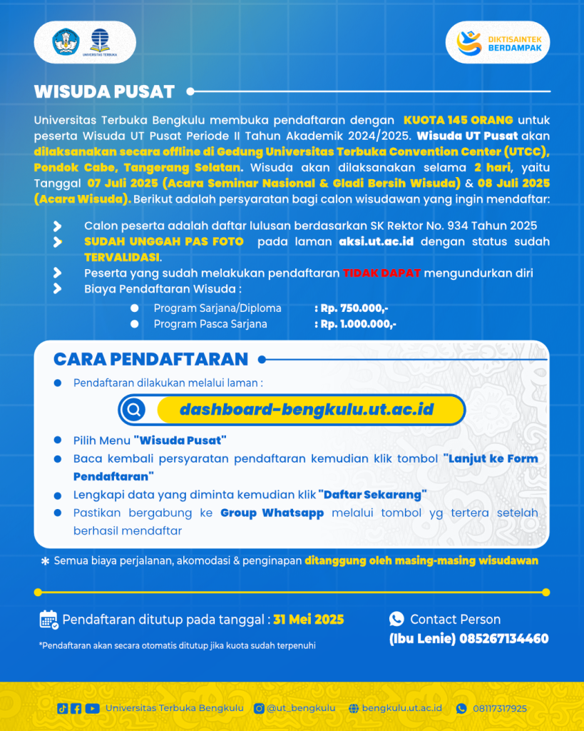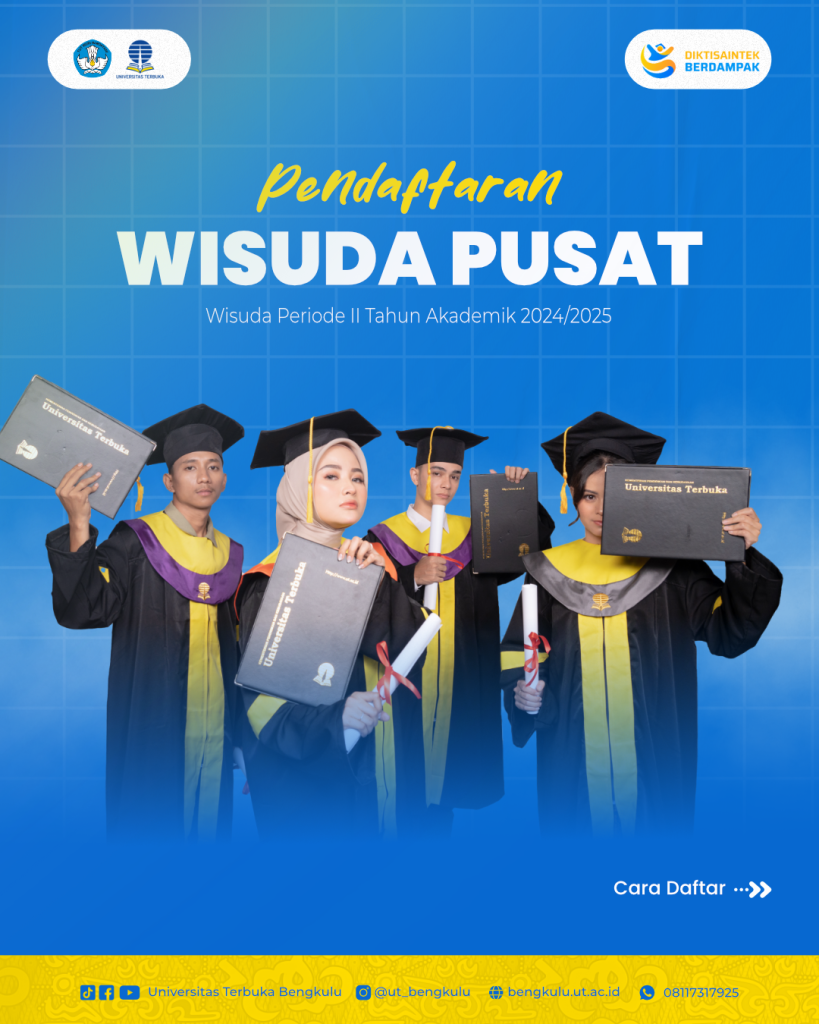 Bagi kamu lulusan Universitas Terbuka Bengkulu, yuk daftarkan dirimu untuk ikut Wisuda Pusat Periode II Tahun Akademik 2024/2025 yang akan digelar secara offline di UTCC, Pondok Cabe, Tangerang Selatan!